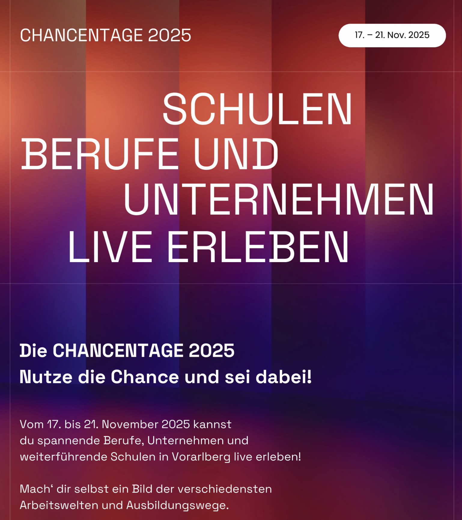 Am 09. – 11.11 triffst Du uns auf der Vorarlberger Ausbildungsmesse. Komm vorbei und informier Dich! Wir freuen uns darauf Dich kennenzulernen.